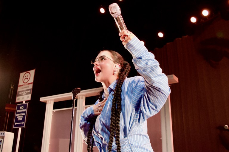 The stage, designed like a bus stop for the LSS Express, featured a payphone that would ring throughout the show. Lauren would pick up and listen to a recording of herself on the other end of the line. These phone calls tied into the next song she performed. For instance, before “small,” there was a message from Lauren about how her body isn’t a project.